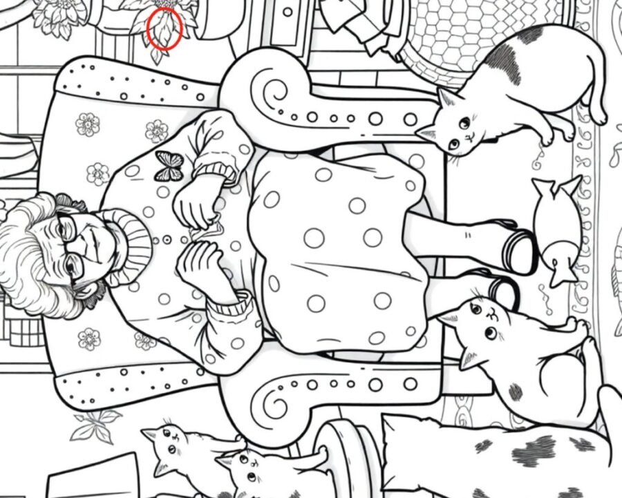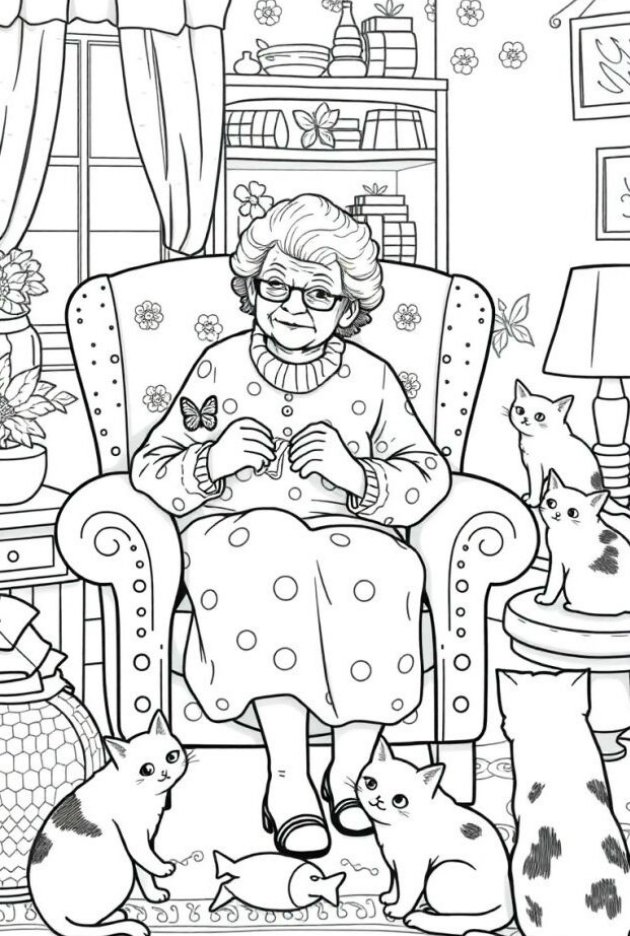 Au centre de l’image se trouve Grand-mère, ses cheveux argentés soigneusement coiffés, vêtue d’une robe à pois et affichant un sourire satisfait. Cinq chats, chacun avec des marques uniques, sont assis attentivement à ses pieds et sur un tabouret à proximité, les yeux rivés sur ses mains. Des livres, des vases et des œuvres d’art encadrées sont alignés sur les étagères derrière elle, tandis que la lumière du soleil filtre à travers les rideaux des fenêtres. Une petite souris tricotée repose sur le tapis à motifs, laissant entrevoir ses friandises artisanales pour les chats. Cette scène raconte une histoire de routine, de camaraderie et de plaisirs simples qui tissent une vie de chaleur.