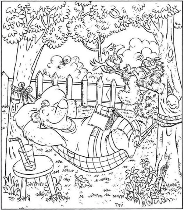 Quoi de mieux qu’un hamac, un verre de limonade et une douce brise qui bruisse dans les arbres ? Dans cette charmante illustration, on voit un ours confortablement installé dans un hamac, vêtu d’un short rayé, un livre ouvert sur le ventre, et le visage dénué de toute inquiétude. Il incarne la détente absolue : entouré d’oiseaux, de soleil, de nature et d’une paix absolue.