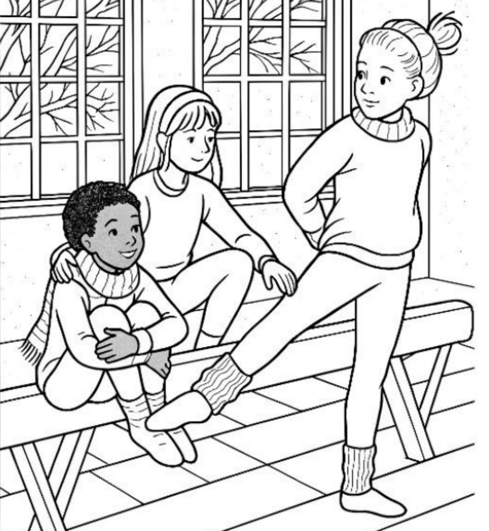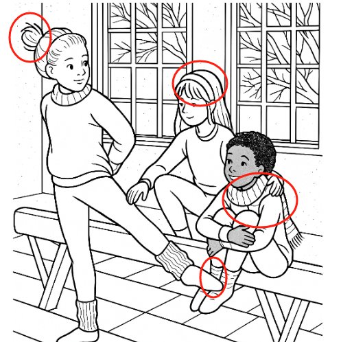 1. Regardez vers le cou de la jeune fille assise : Le col de son pull pourrait cacher partiellement un drapé supplémentaire.