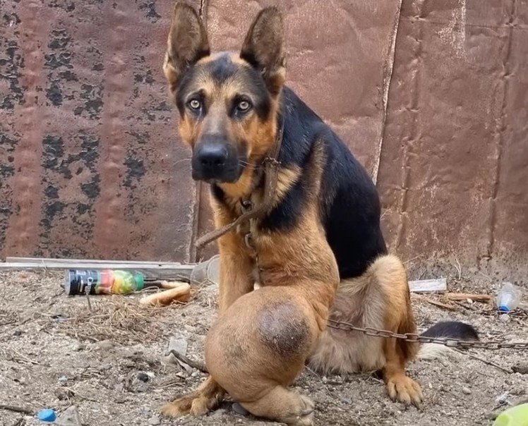 - État avant le sauvetage : Chaîne courte, manque de nourriture et d’eau, coups infligés par le propriétaire.