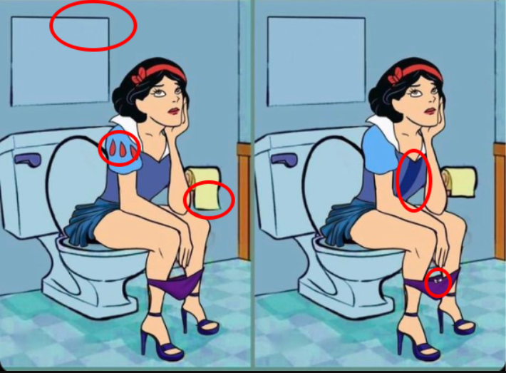 Qui a dit que les princesses scintillaient toujours dans les salles de bal ? Dans ce scénario décalé, notre héroïne emblématique se retrouve perchée sur un trône de porcelaine, rêvassant dans une salle de bain aux tons pastel. Deux clichés côte à côte sont presque identiques, à l’exception de cinq modifications ludiques. Prêt à faire travailler vos yeux comme des rois ? Plongeons dans cette histoire de toilettes inattendue et apprenons à repérer chaque changement sournois.