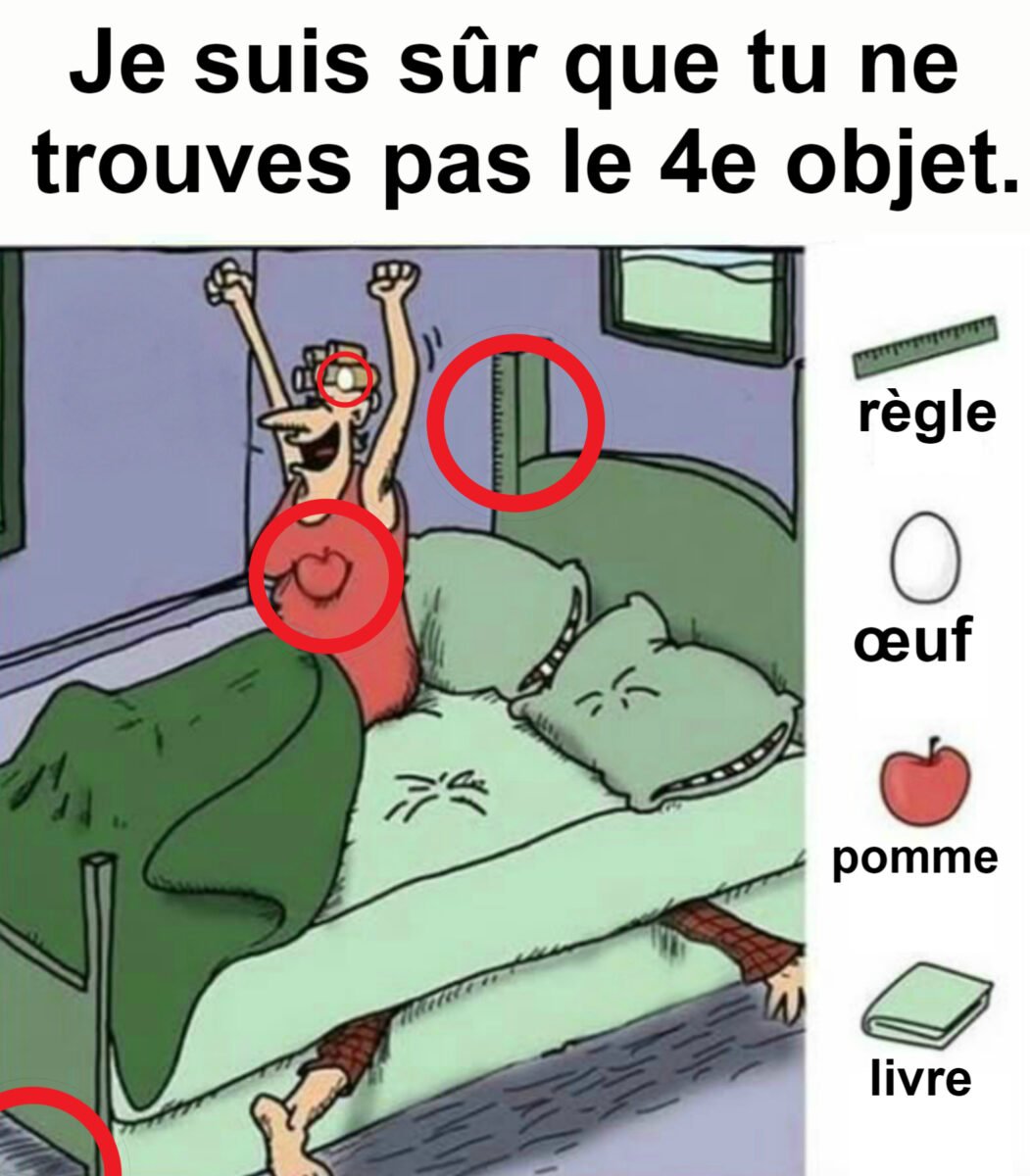 Si vous vous surprenez à tourner sans cesse autour des chiffres sans découvrir ce quatrième objet, éloignez-vous une minute. Une courte pause rétablit votre concentration visuelle. Revenez avec un regard neuf et vous remarquerez probablement ce que vous aviez manqué, comme la tranche du livre qui dépasse sous le montant du lit.