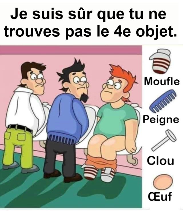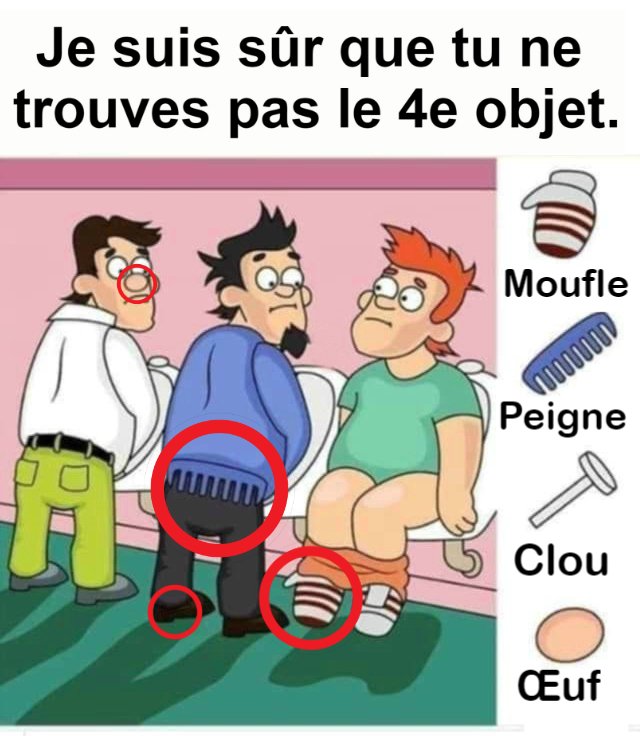 À première vue, cette image présente une scène classique : trois hommes debout dans des toilettes publiques, dont un assis sur des toilettes. Mais il y a un détail : l’énigme vous invite à trouver l’insaisissable « quatrième objet » parmi une liste d’objets. Les objets présentés – une mitaine, un peigne, un clou et un œuf – semblent simples, mais parviendrez-vous à trouver le quatrième objet astucieusement caché ?