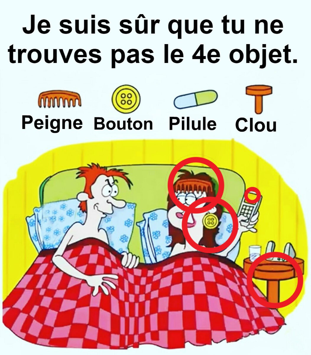Trouvez Peigne, Bouton, Pilule, Clou. Consultez le premier commentaire pour la réponse 👇
