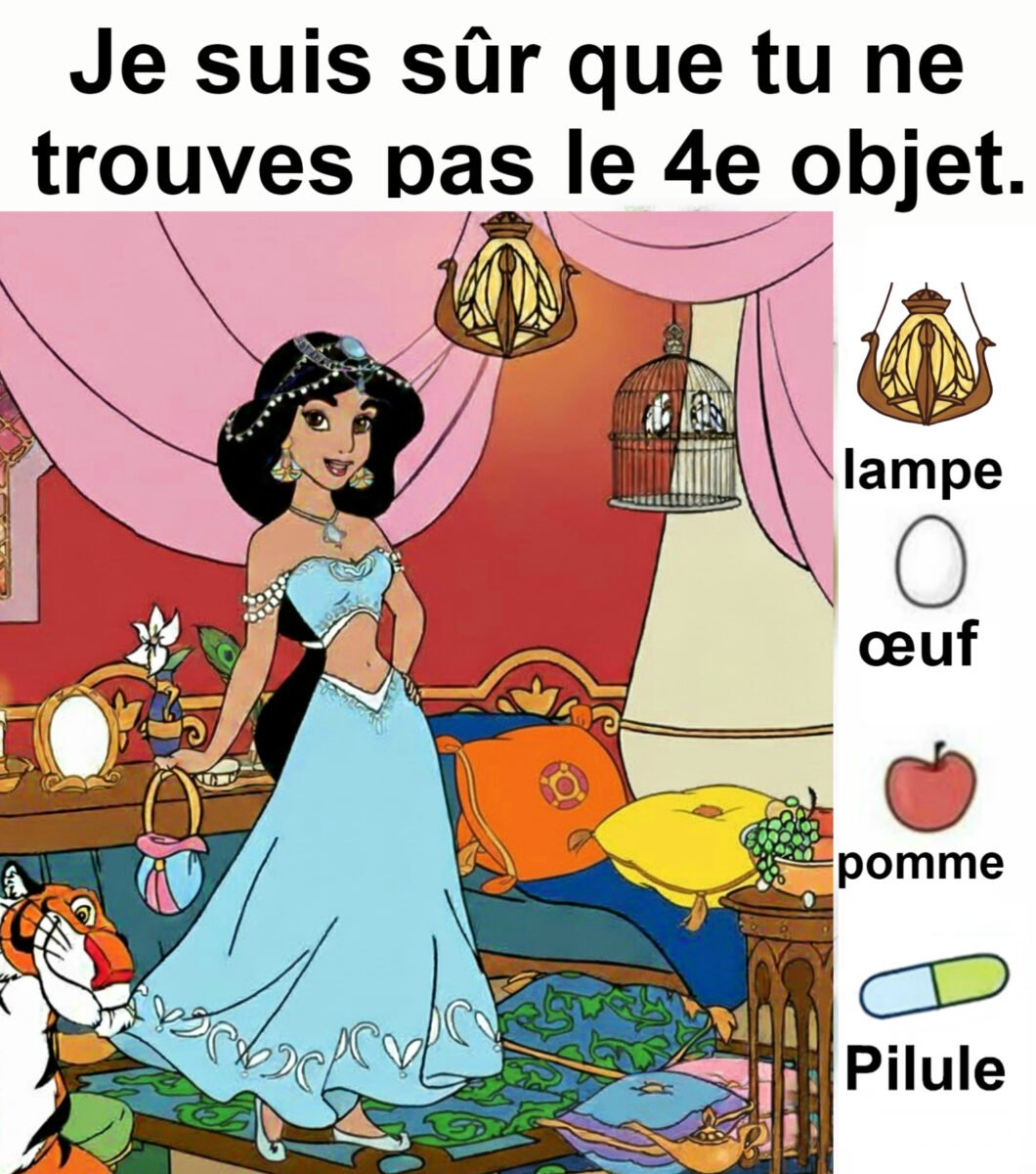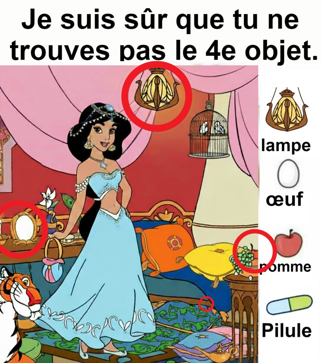 Trouvez la lampe, l’œuf, la pomme et la pilule.