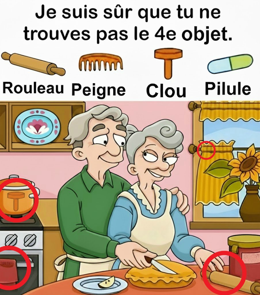 Trouvez Rouleau, Peigne, Clou, Pilule.