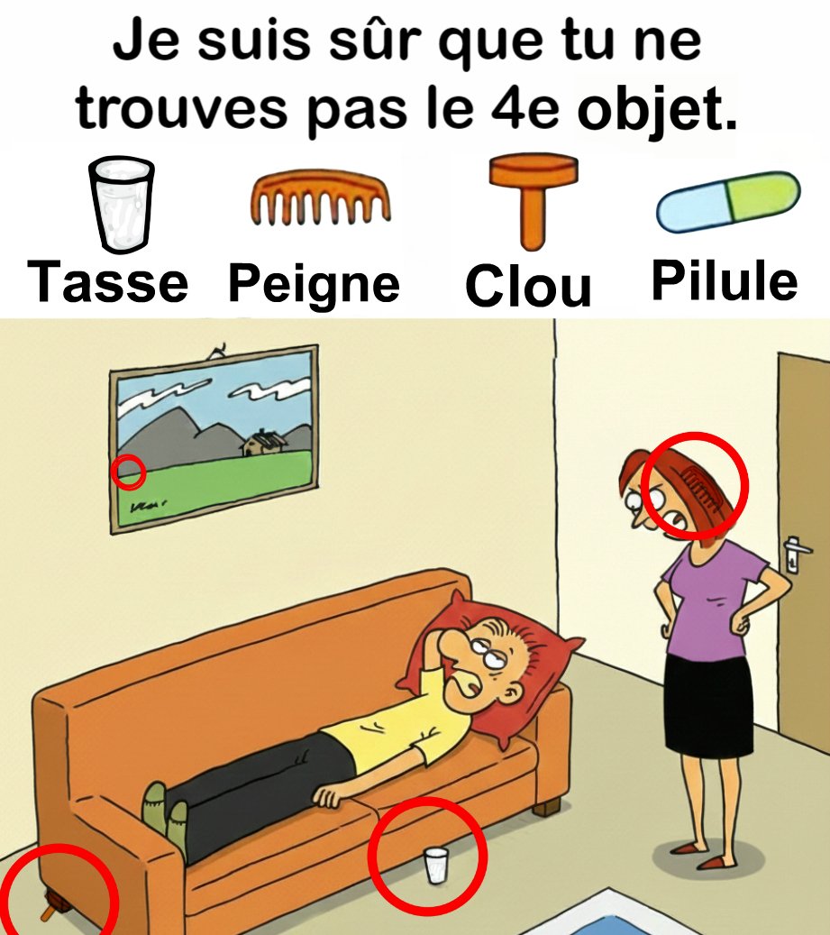 Trouvez Tasse, Peigne, Clou, Pilule.