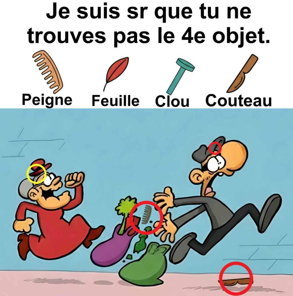 Trouvez peigne, feuille, clou et couteau.