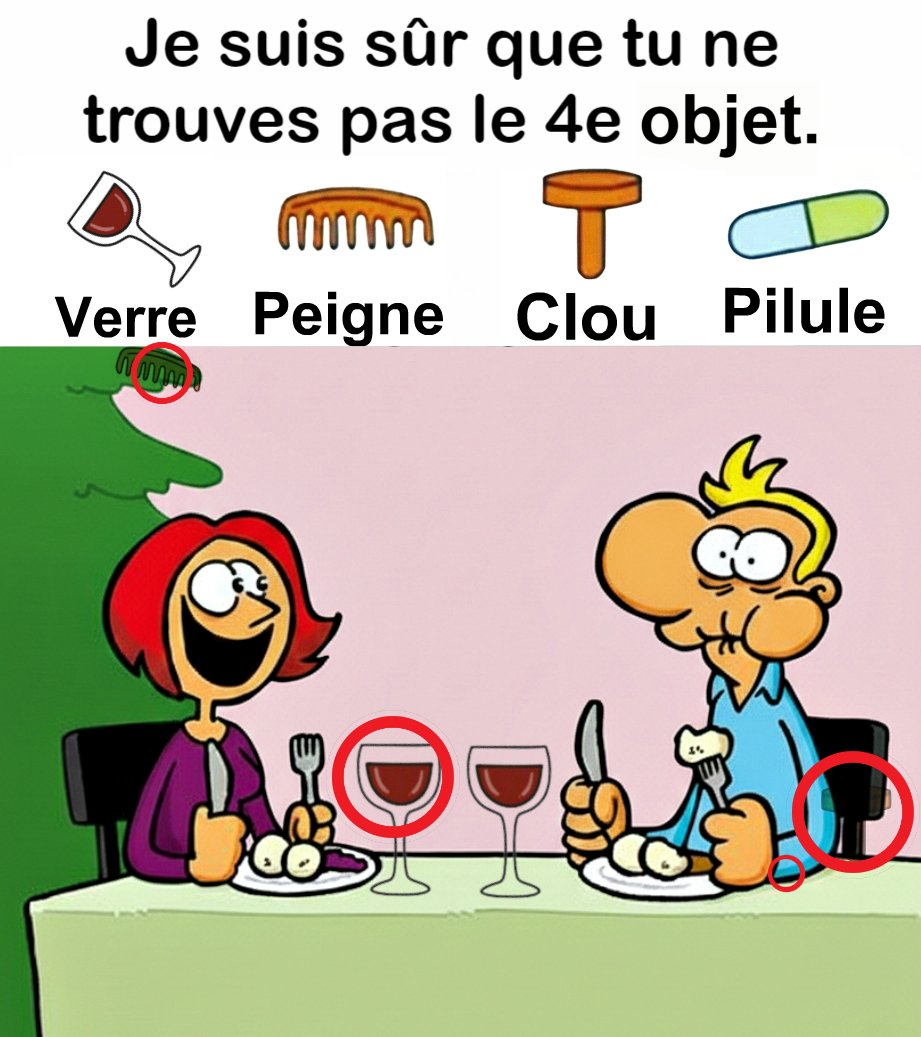 Trouvez Verre, Peigne, Clou, Pilule.