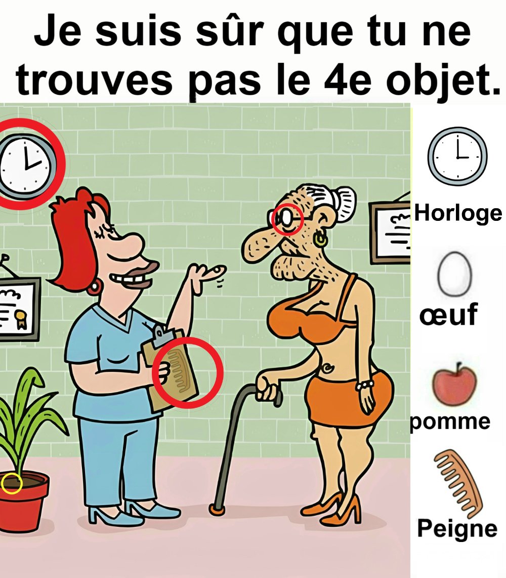 Trouvez le horloge, l’œuf, la pomme et le peigne.