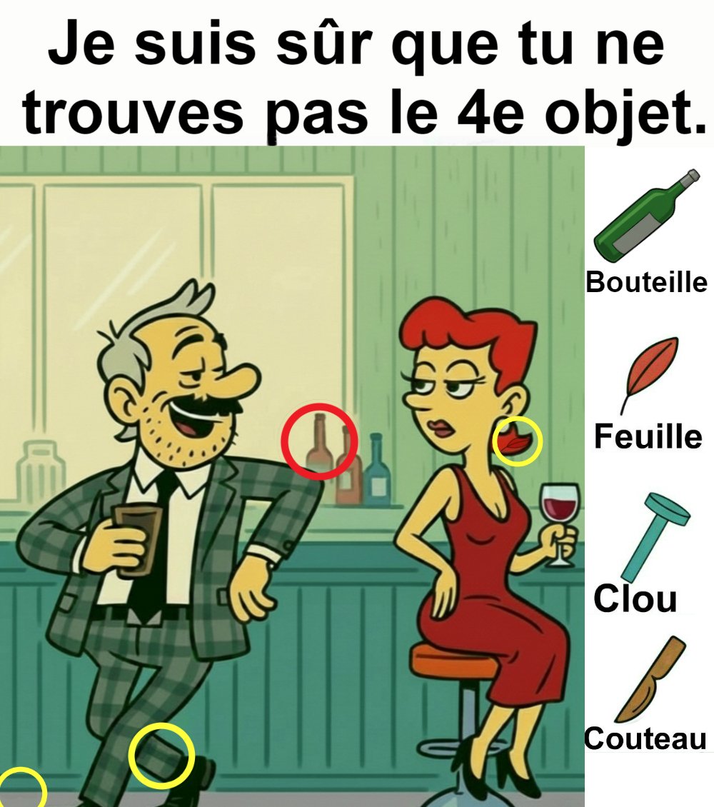 Trouvez bouteille, feuille, clou et couteau.