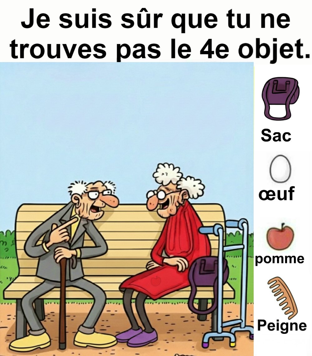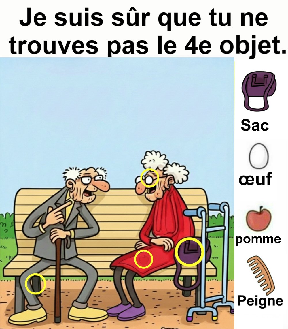 Trouvez le sac, l’œuf, la pomme et le peigne.
