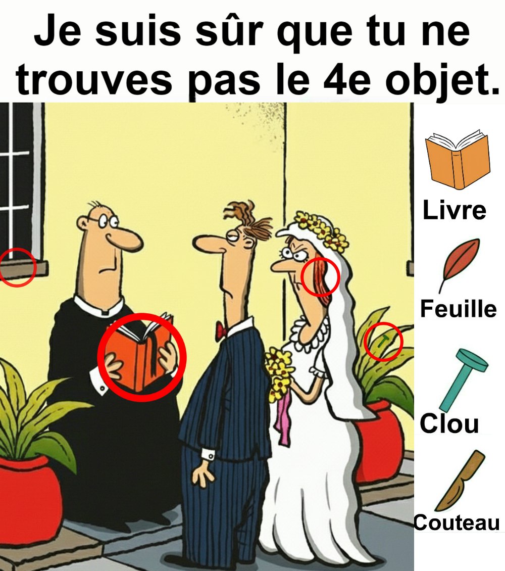Trouvez livre, feuille, clou et couteau.
