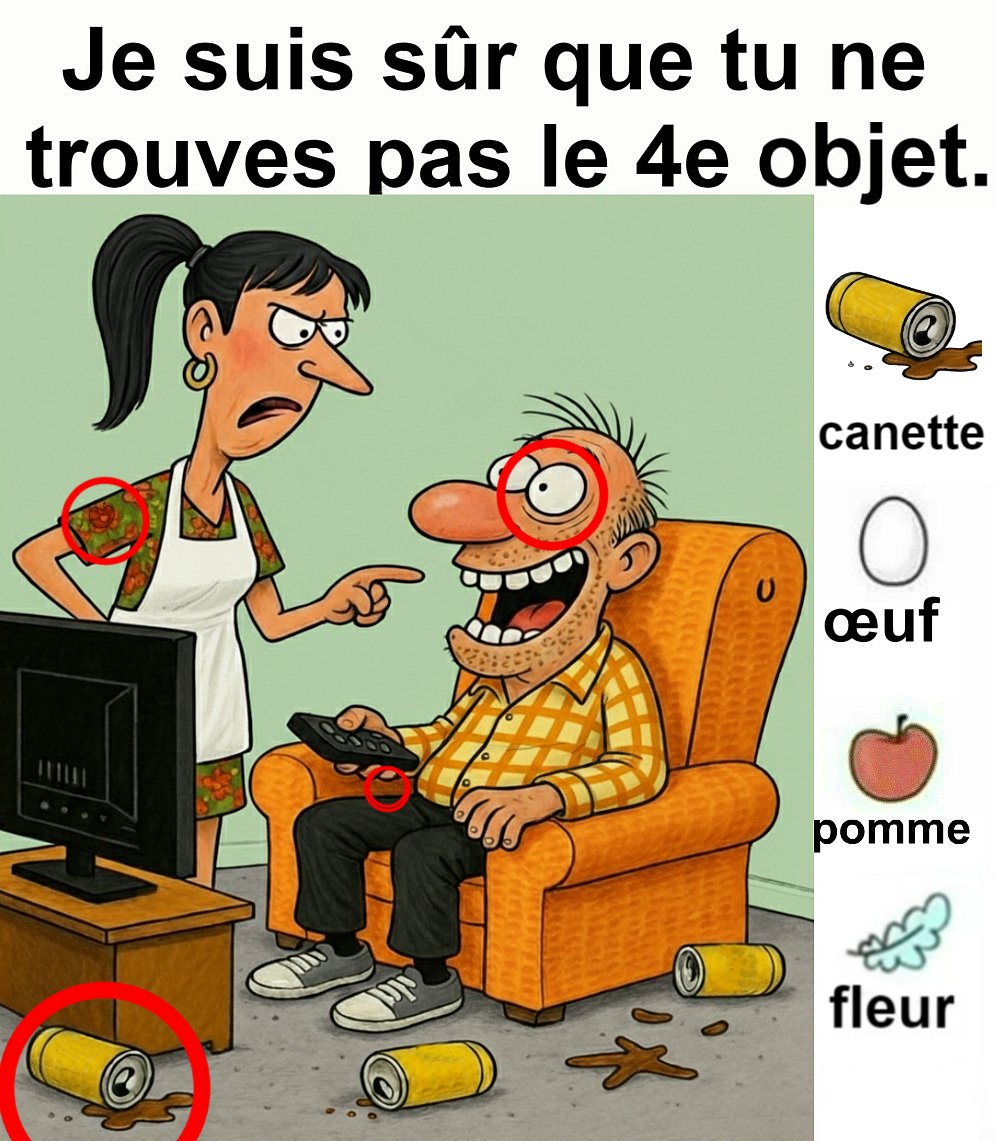 Trouvez la canette, l’œuf, la pomme et le peigne.
