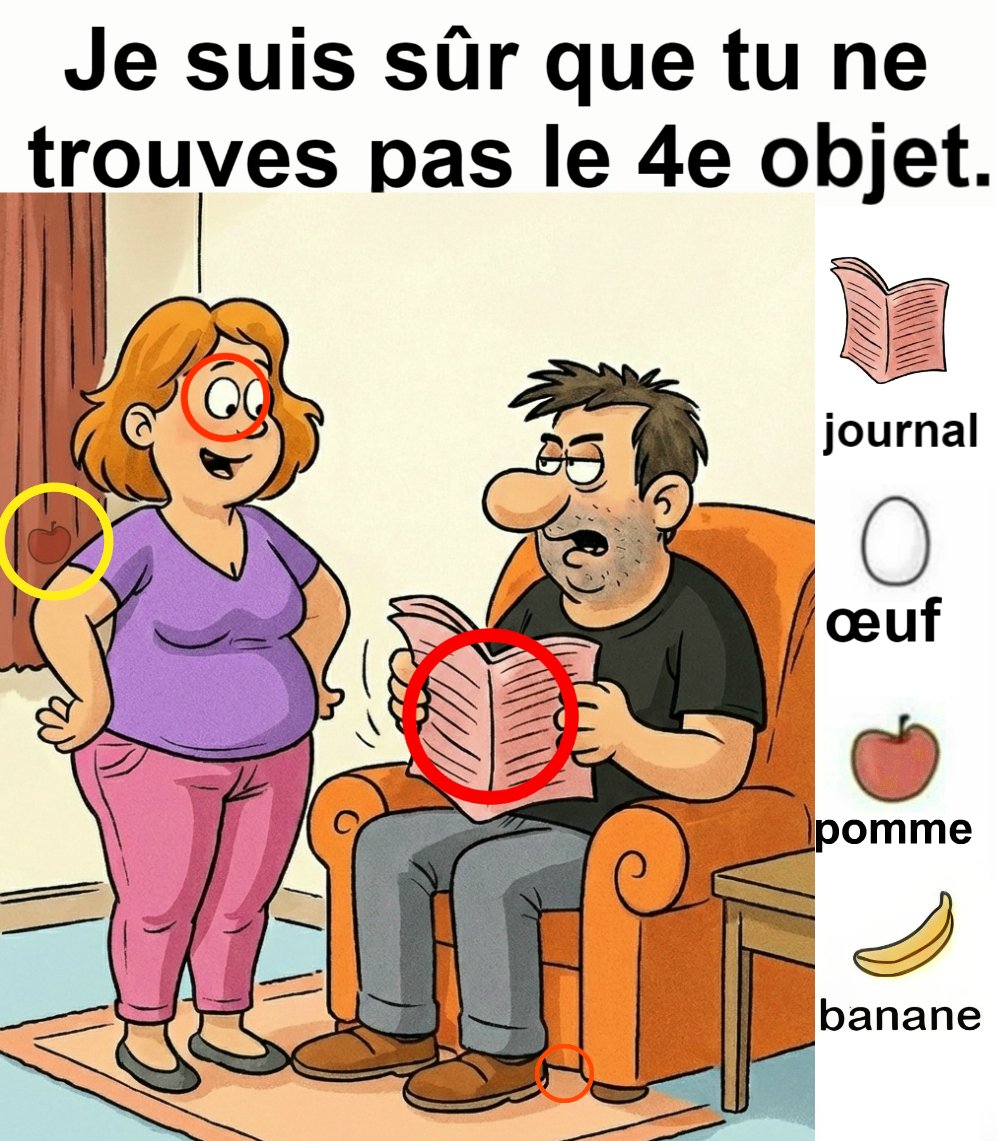 Trouvez le journal, l’œuf, la pomme et le banane.