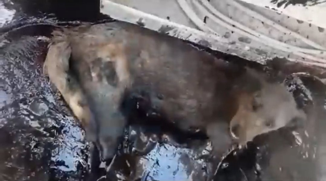 Nous essayons de sauver cette chienne. Cherchant désespérément de la nourriture, elle est tombée dans une fosse d’asphalte bouillant.