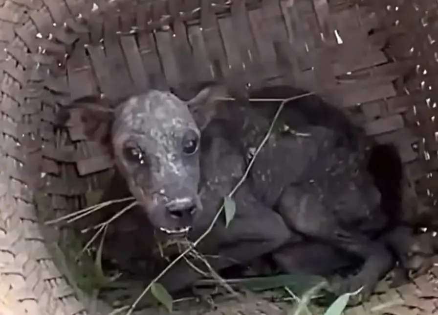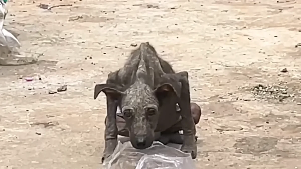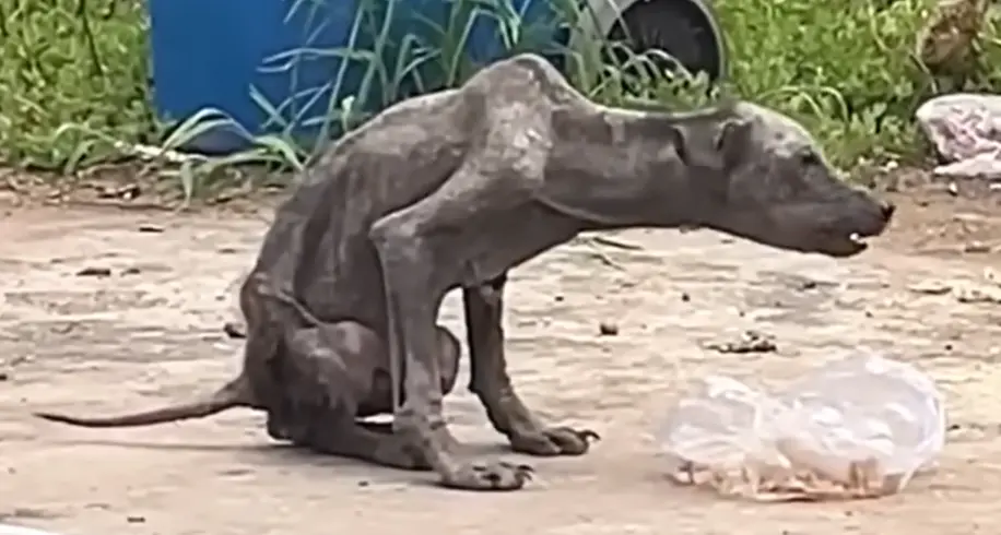 Un chien errant, maigre comme une ombre, recroquevillé dans une poubelle.