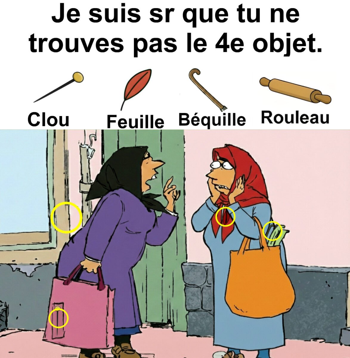 Trouvez clou, feuille, béquille et bougie.