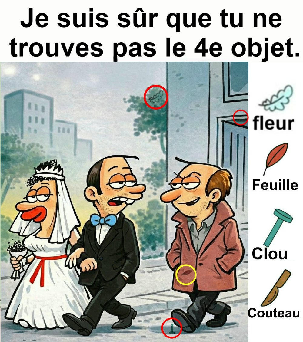 Trouvez fleur, feuille, clou et couteau.