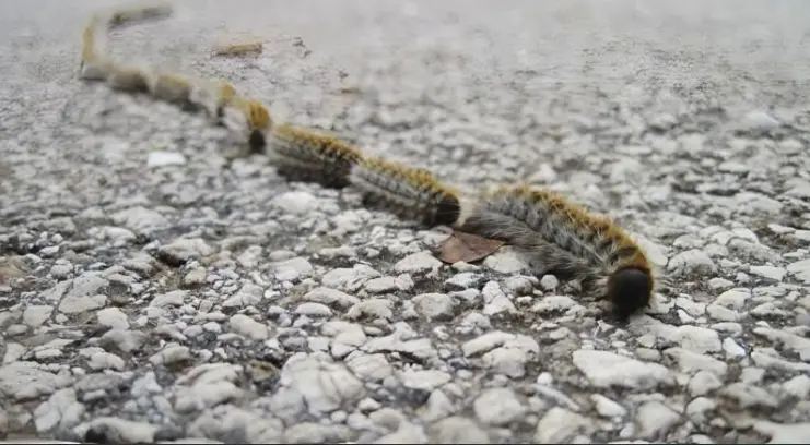 Devant moi rampait lentement une colonne de ce que j’ai ensuite compté : environ 150 chenilles ! Elles avançaient en file indienne, bien serrées les unes contre les autres, comme si elles suivaient un chef invisible.