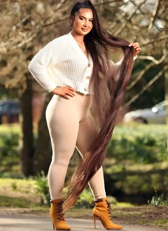 Ses cheveux mesurent 182 centimètres de long – presque autant que sa propre taille. Ils semblent avoir leur propre vie : soyeux, épais et foncés, ils touchent le sol malgré toutes les coiffures ou la hauteur des talons.