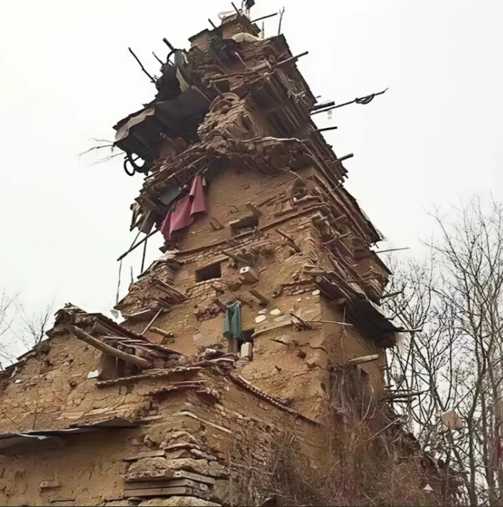 Construite à la main par un homme de 55 ans, elle s’élève sur sept étages et est faite de matériaux de récupération : boue, briques cassées, argile, bambou, branches et gravats.